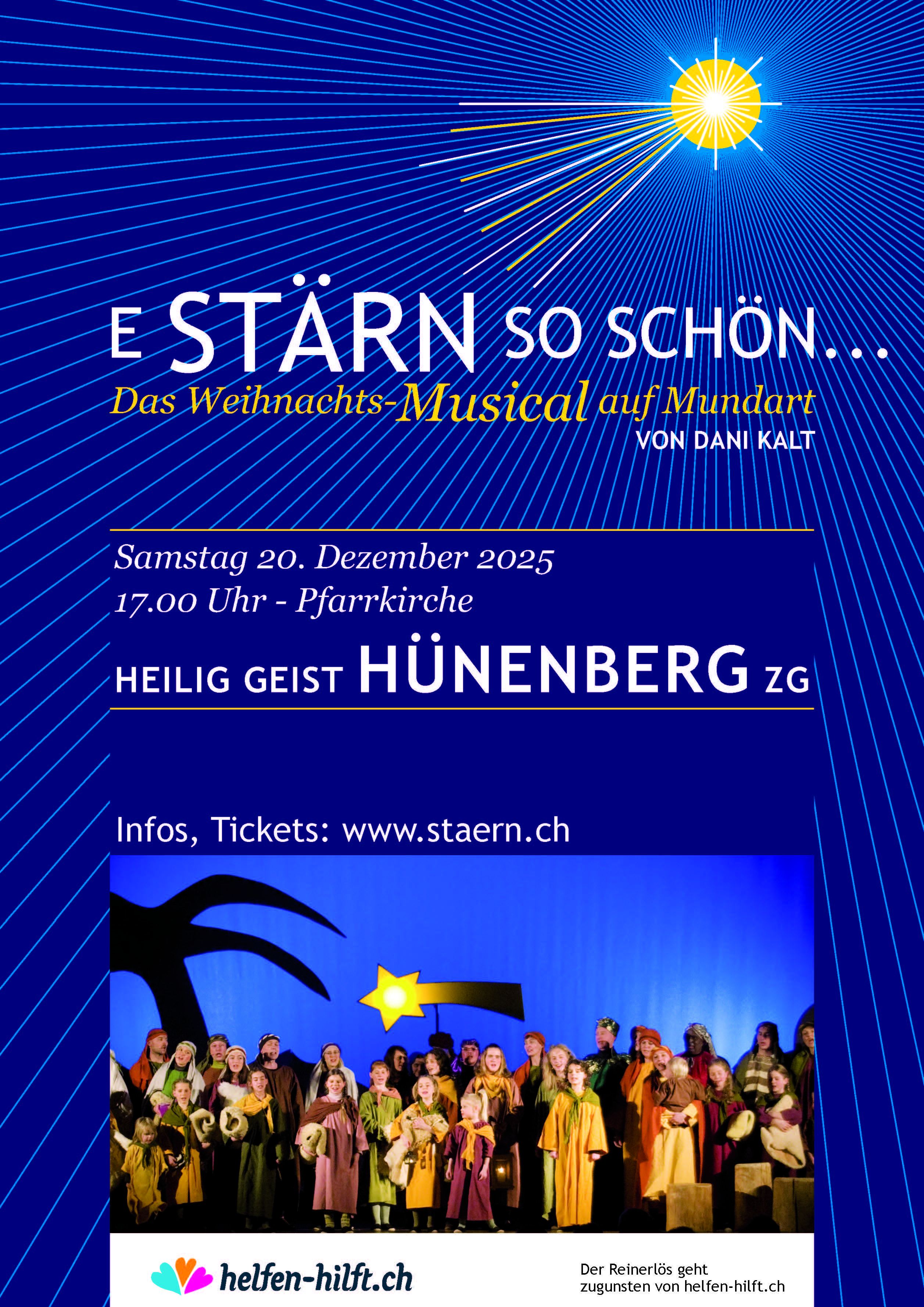 Alle, die sich so richtig gefühlsvoll auf Weihnachten einstimmen wollen, erwartet am 20. Dezember 2025 eine besondere Überraschung. Um 17.00 Uhr wird in der Pfarrkirche Heilig Geist in Hünenberg / ZG das Weihnachtsmusical „E Stärn so schön...“ von Dani Kalt aufgeführt. Während 90 Minuten erwecken 28 grosse und kleine Sängerinnen und Sänger die Weihnachtsgeschichte musikalisch zum Leben. Melodiöse Balladen, einfühlsame Liedertexte und Dialoge sowie viele moderne Rhythmen sorgen für ein unvergessliches Erlebnis.