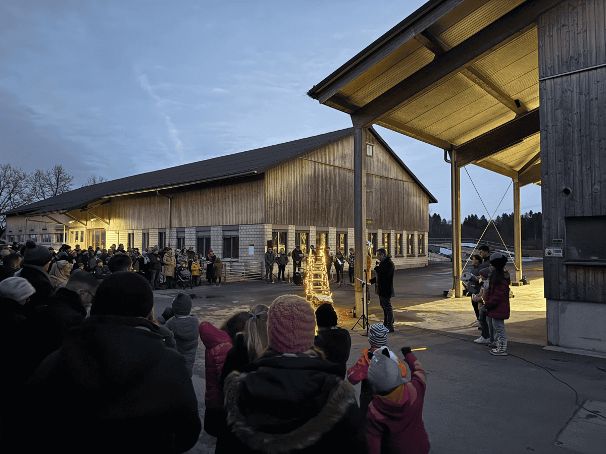 Am Heiligabend rollten Autos wie an einer Lichterkette in die Chamau. Auch zu Fuss hatten sich viele Familien auf den Weg gemacht. So sammelten sich mehrere hundert Menschen auf dem Gutsbetrieb, um gemeinsam Weihnachten zu feiern: draussen auf dem Hof mit Blick auf die Kühe und Maschinen des modernen Betriebs, daneben bimmelten die Glöckchen der herzigen Schaf-Familie. Einzige Deko: Strohballen mit dem Jesuskind und die beleuchtete Bockleiter. Die Botschaft: Egal, wie sehr du dich abmühst auf der Leiter beruflich, religiös, privat hinauf zu steigen; egal, wie erfolgreich du bist – Gott steigt zu dir herab! Du brauchst nichts leisten! Er will bei dir sein. Das ist Weihnachten! Wie Hoffnungsfunken leuchteten so auch die Knicklichter in den Händen zur Weihnachtsgeschichte. Dank der Dousnbrass-Band sangen alle freudig und herzerwärmend die bekannten Lieder und gingen Weihnachts-froh nach Hause. Ein herzliches Dankeschön allen, die mitgeholfen haben, diese eindrucksvolle Feier zu gestalten.